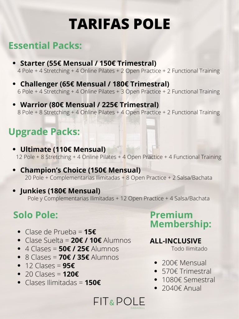 BONOS: Si no quieres un cobro mensual ni pagar matrícula, y solo te interesan las clases de Pole Dancing, elije esta opción. Tienes bonos de 5 y 10 sesiones, con caducidad de 1 año.